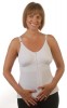 Front Velcro closure postsurgical camisole Easy to slip on and fasten in front. Works well for women with limited mobility. Fine, “no-pill” combed cotton. Additional under-bust support. Two Removable Drainage Tube Pouches. Two triangular fiberfill breast forms. No inside seams. Material: Front, back and pockets, 92% cotton/ 8% spandex. Latex-free. Color: White. Available in Sizes: